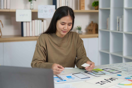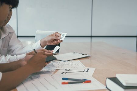 Close up ux developer and ui designer brainstorming about mobile app interface wireframe design on table with customer breif and color code at modern office.Creative digital development agency