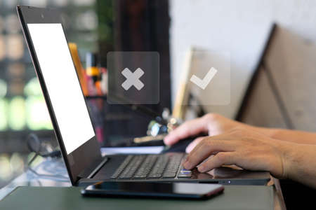 Close up of businessman hand using laptop computer with blank screen for mockup.