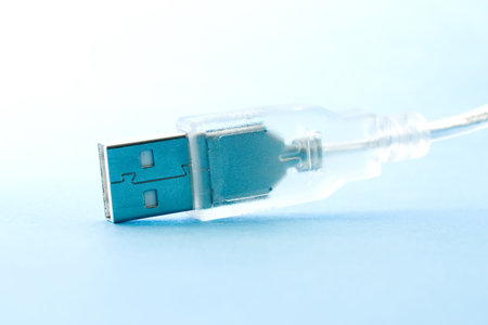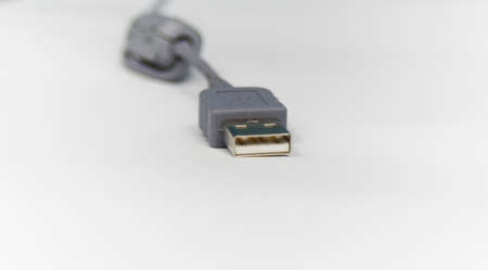 This image features a close-up of a USB plug with a gray cable against a neutral background, illustrating modern technology and connectivity essentials for digital devices.