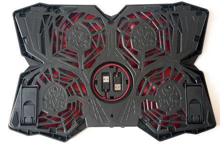 Cooling pad for laptop computer with red light with USB wire on white background. Notebook Cooling Stand. Closeup