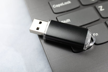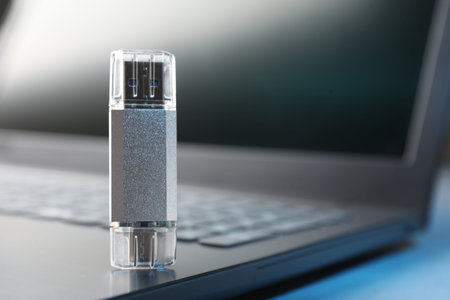 Usb flash drive on laptop, closeup