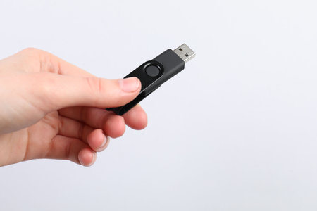 Hand holding a modern flash drive on a light gray background, closeup
