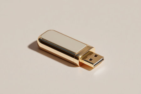 A sleek gold USB flash drive rests on a smooth, light-toned surface, highlighting a minimalist tech aesthetic. The compact gadget conveys luxury and modernity, suitable for branding, storage, and presentation contexts. Use this image in electronics campaigns, office communications, and design-focused content where tech meets style.