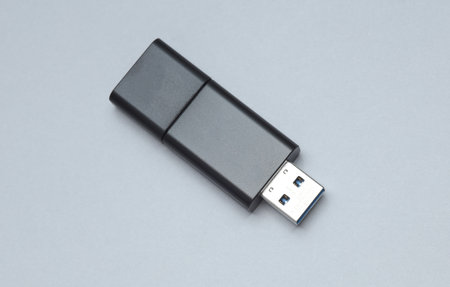 Black USB flash drive on a gray background