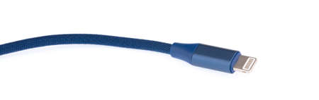 White lightning cable on a blue background, close up