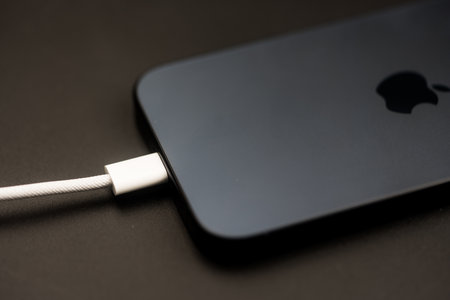 Bangkok, Thailand - November 4, 2023 : Usb type C cable charger a iPhone 15 Pro blue Titanium on a black backgrounda