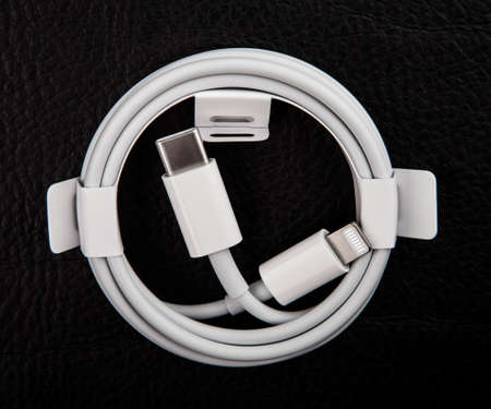 Apple Lightning to USB-C cable on the white background, macro. Apple is a multinational technology company. Moscow, Russia - September 15, 2020