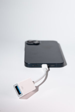 A smartphone connected to a USB adapter as a portable communication device for port-based data transfer.