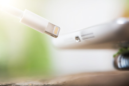 Lightening plug data cable at camera with large depth of field. Isolate on bright colored background.