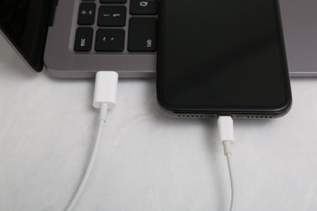 Smartphone connected with charge cable to laptop on light table, closeup