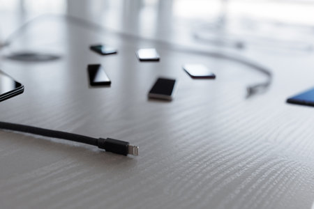black and white USB charger cord and jack for mobile devices on office table gray surface simple background space for copy or your text