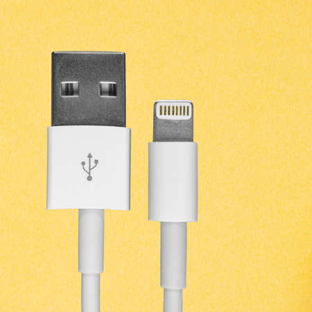 Lightning usb cable close-up on a yellow background with a place for infographics or text, a mockup for a marketplace