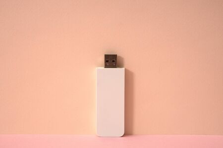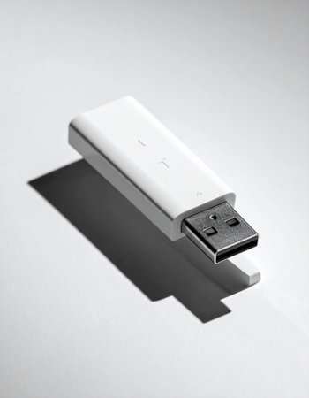 A single, modern USB drive rests on a clean, white surface, its sharp shadow hinting at the importance of the digital information it holds.