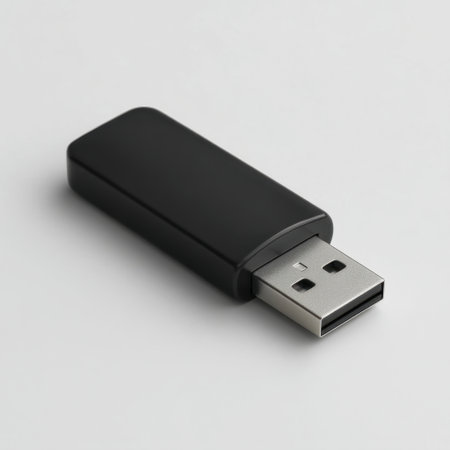 A sleek black USB flash drive isolated against a light background, ideal for photography focused on technology, data storage, and modern accessories.