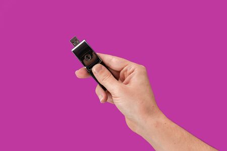 Close-up of male hand holding usb flash adapter for sd card isolated on background of red color.