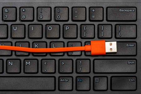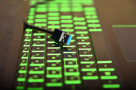 Usb cable connector on a black laptop keyboard close up. Toned image.
