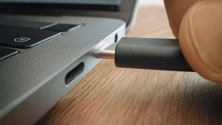 Close-up Macro Shot: Laptop on the Desk, Person Inserts USB-C Cable Adapter into Computer Port.