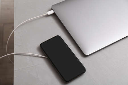 Modern smartphone and laptop charging from power bank on gray table, above view