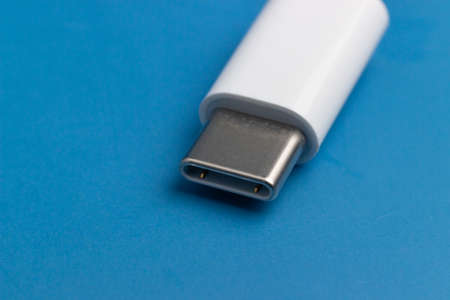 View from above of long USB-C Cable manufactured for fast data and peripheral transmission - isolated on blue background