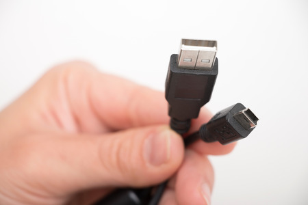 Hand holding usb cable on white background