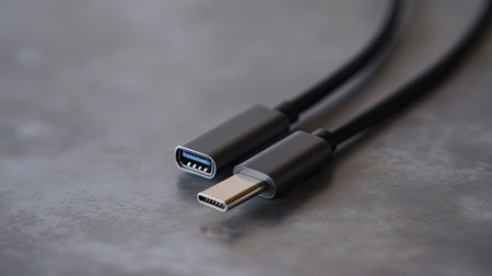 USB Type-C cable with metallic ends lying on a sleek gray background, highlighting modern tech accessories