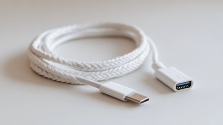 The image features a USB-C cable isolated on a white background. The cable is prominently displayed, showcasing its USB-C connector at the end. The white background enhances the visibility of the cable, making it the central focus of the image.