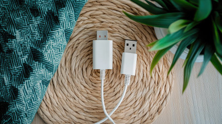 A pristine USB cable positioned on a natural fiber mat with a green plant and textile background, perfect for showcasing modern technology and home office aesthetics.