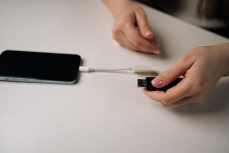 Closeup view of unrecognizable woman connecting usb flash drive to smartphone through adapter cable, facilitating data transfer and expanding mobile storage sitting on clean white table.