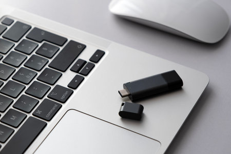 USB flash drive lying on gray laptop case in front of his keyboard. Virtual memory storage with USB type-c output