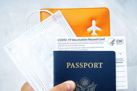 US passport with a Covid-19 vaccination record card, face mask and documents organizer in hand. Pandemic time travel concept.