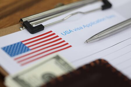 immigration and travel concept showing usa visa text with stars and stripes in the background
