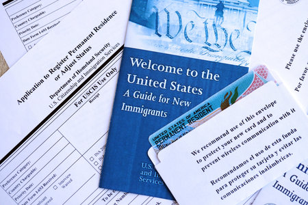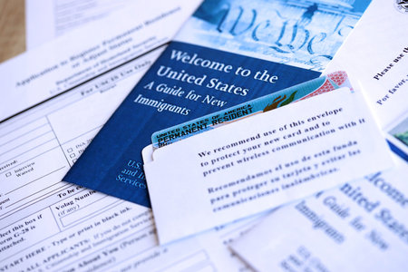 Permanent resident green card in envelope with application and guide for new immigrants lies on table close up
