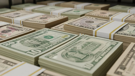 Tightly bound stacks of one hundred dollar bills are organized on a wooden surface, representing substantial wealth. The currency bands provide a colorful contrast to the monochrome money. AI generation