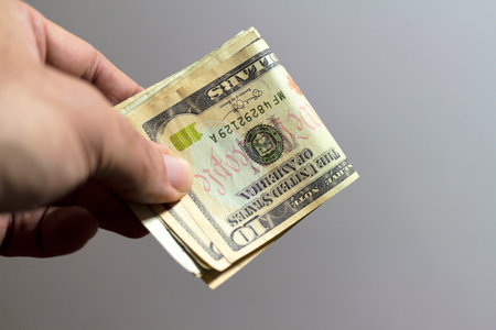 Hand holding showing dollars money and giving or receiving money like tips, salary. 10 USD banknotes, American Dollars currency isolated with copy space.