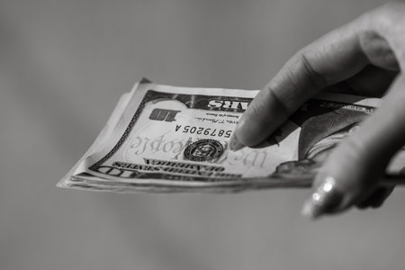 Close up of female hand holding money - US dollar banknotes against dark background