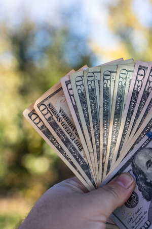 Male hand holding a dollars banknotes. Selective focus of a man with American money closeup.