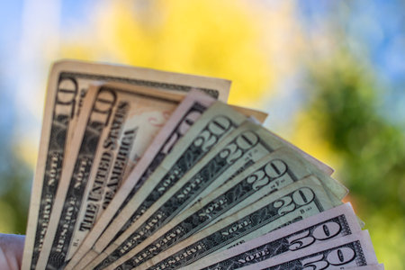 First person top view photo of hands holding fan of dollars banknotes on plant background