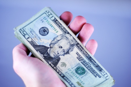Dollar Bills. Twenty Dollars Bills in (Male) Hand. Blue Background