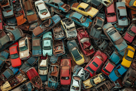 A bird's-eye view of abandoned multicolored old cars.