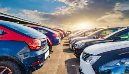 View of car dealership - rows of used cars for sale. High quality photo