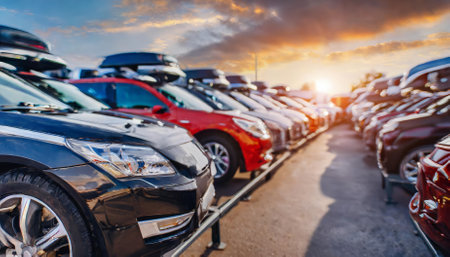 Cars for sale, vehicle or lot for dealership salon in parking or line up. Colorful, model or display