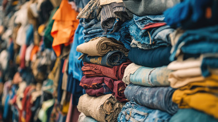 A vibrant display of stacked textiles in various colors, showcasing different materials and textures. This collection emphasizes organization and color variety in textile storage.