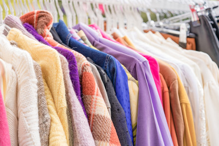 Close-up view of a boutique clothing rack with various stylish garments, textures, and vibrant colors in a trendy store. concept of fashion, clothing diversity, retail style.