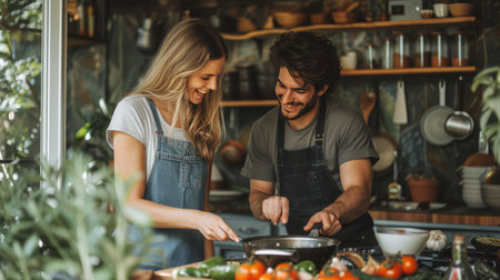 A cheerful couple enjoys cooking together in a stylish kitchen, fostering warmth and connection. Their laughter and enthusiasm create a vibrant cooking atmosphere.