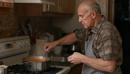 An elderly man stands by the stove, stirring a pot of soup while wearing an apron. The kitchen is warm and inviting, filled with homely details and soft lighting.