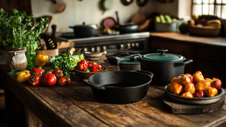 A rustic kitchen scene featuring fresh vegetables and cookware on a wooden table. The warm ambiance highlights culinary preparation and healthy ingredients.