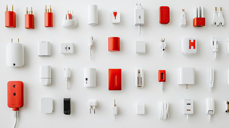 A vibrant arrangement of red and white electrical connectors and chargers displayed on a white background, showcasing modern technology and design elements.