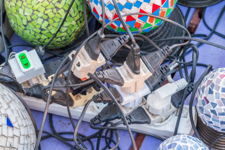 Old and damaged electric adapter power plug has many appliances are plugged outlet socket concept of risk danger overloaded current electrical. Overloaded power plugs, close up