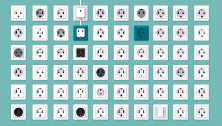 A teal wall displays a grid of various electrical outlets, showcasing a diverse range of plug styles and colors, with a single plug connected to one