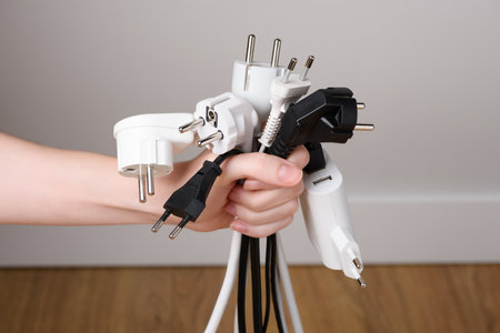 A bunch of disconnected electrical plugs with cables in a hand in room. Saving electricity concept